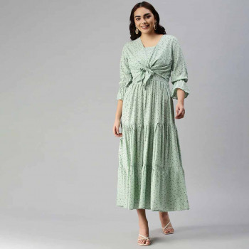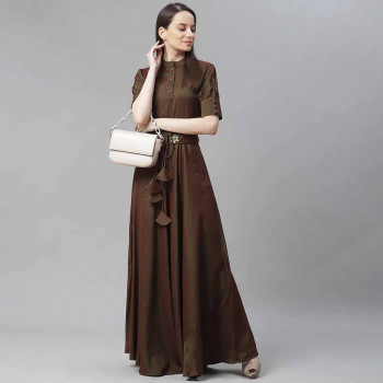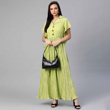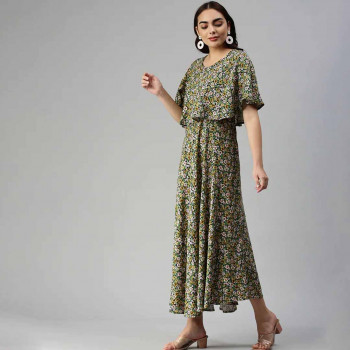 bell sleeved gathered maxi dress looking for some awesome collection of dresses? well, lay your hands on this dress and also get the option of choosing from black colour. dress up in a soothing pattern and don this dress made of crepe material.