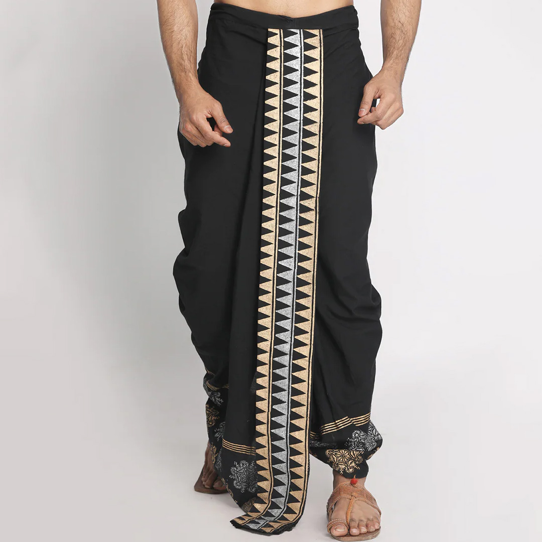 get traditionally stylish with this black pure cotton geometric pattern handblock print dhoti. featuring front and back pleats and drawstring details. dhoti is the traditional attire for men across india. it is often misinterpreted with lungi or loongi, but is a different attire.