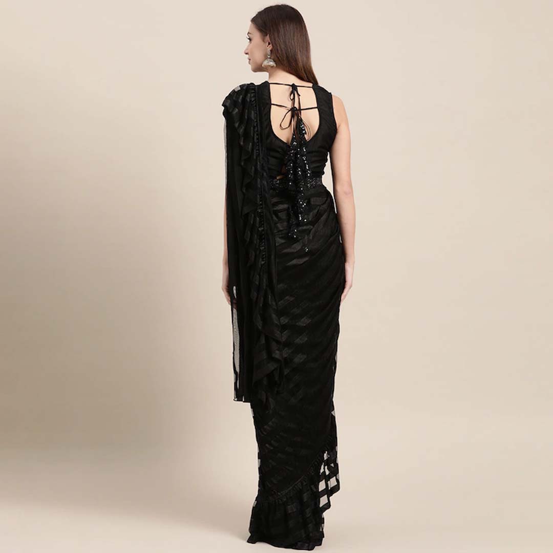 Black self-striped ruffled ready to wear saree, has snap button closure Comes with a stitched blouse in black, has a V-neck, sleeveless, tie-up closure