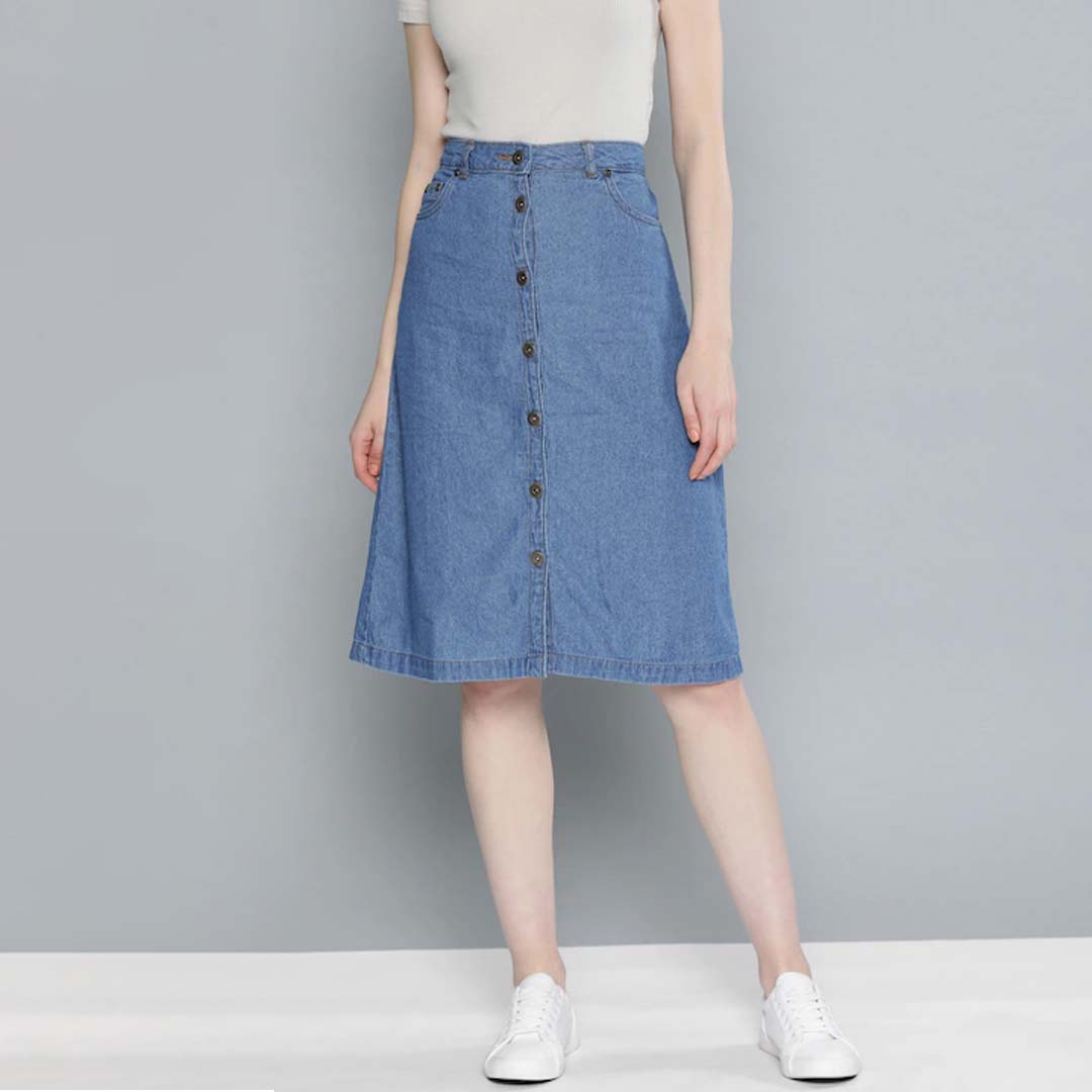 Blue solid denim skirt, has an elasticated waistband with a button closure, straight hem