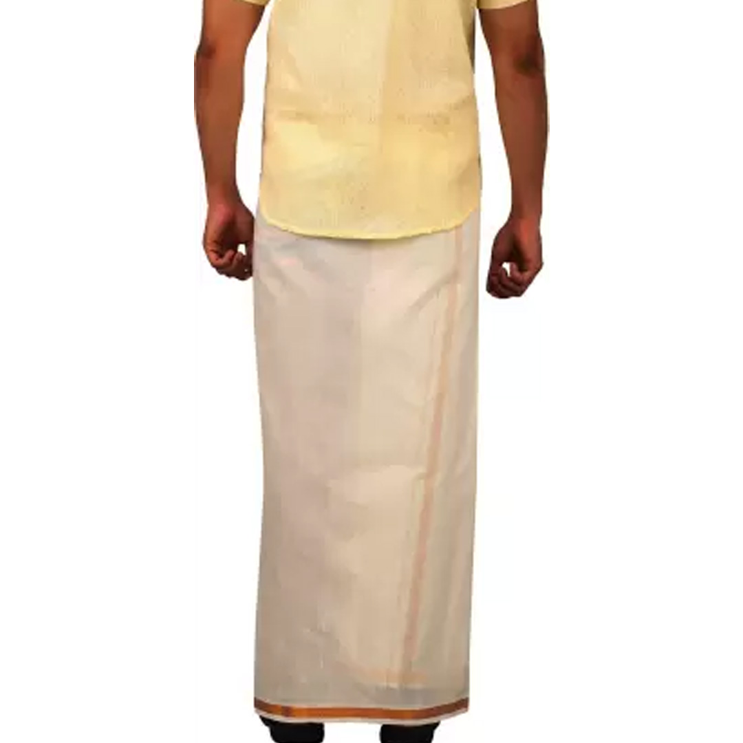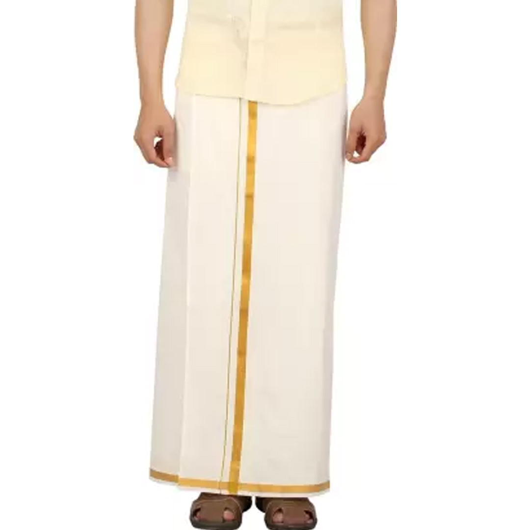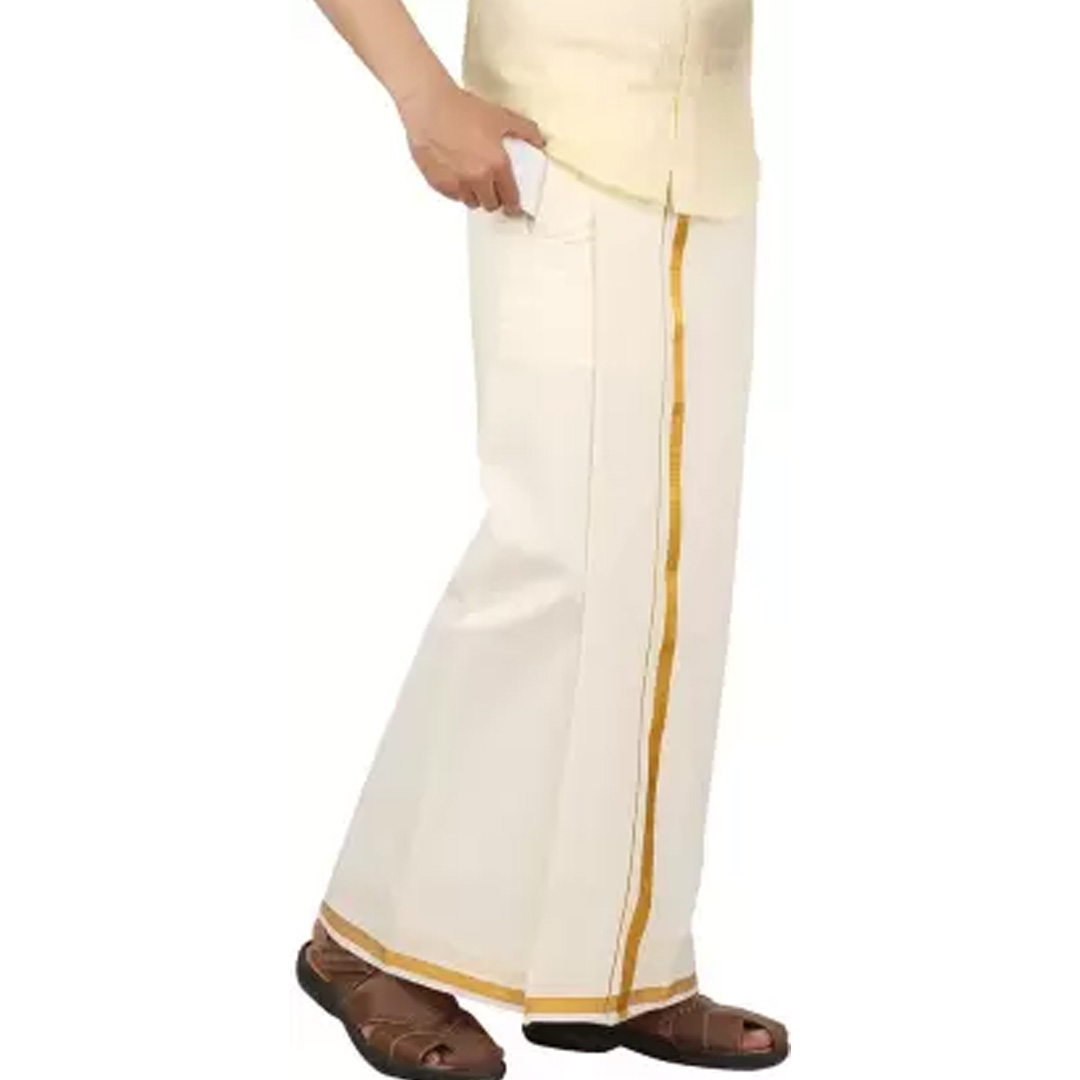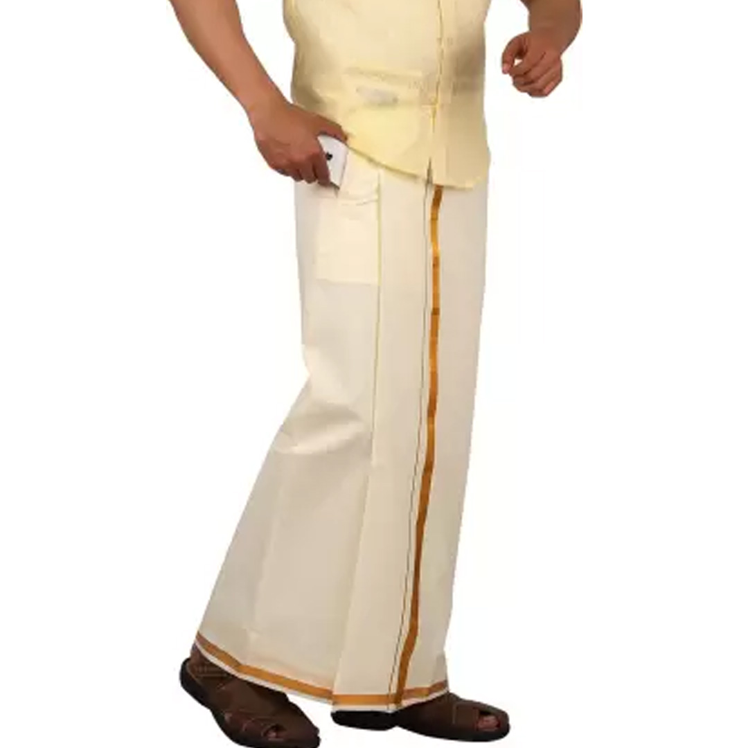 A Pure Compact Yarn Premium quality Welcro Pocket Dhoti with Gold Jari border and its a single pocket on right Side for wallets and cellphones,