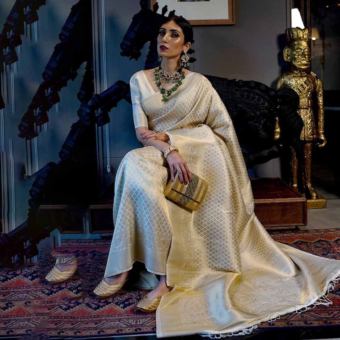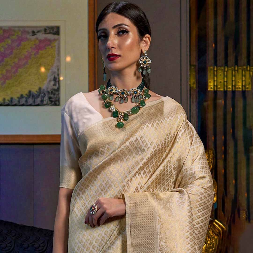 Cream-coloured and gold-toned kanjeevaram saree Ethnic motifs woven design saree with zari border Has zari detail