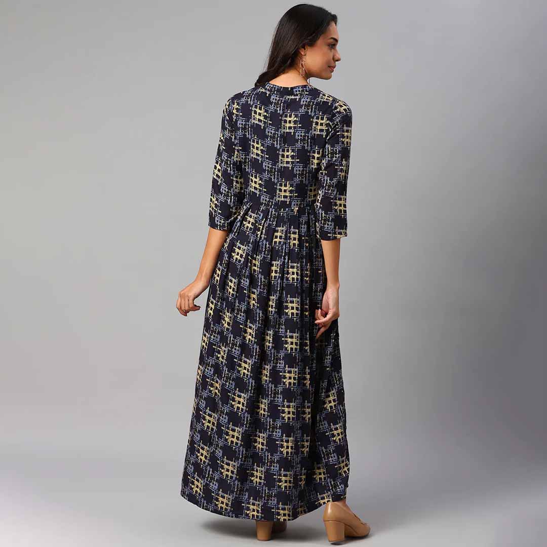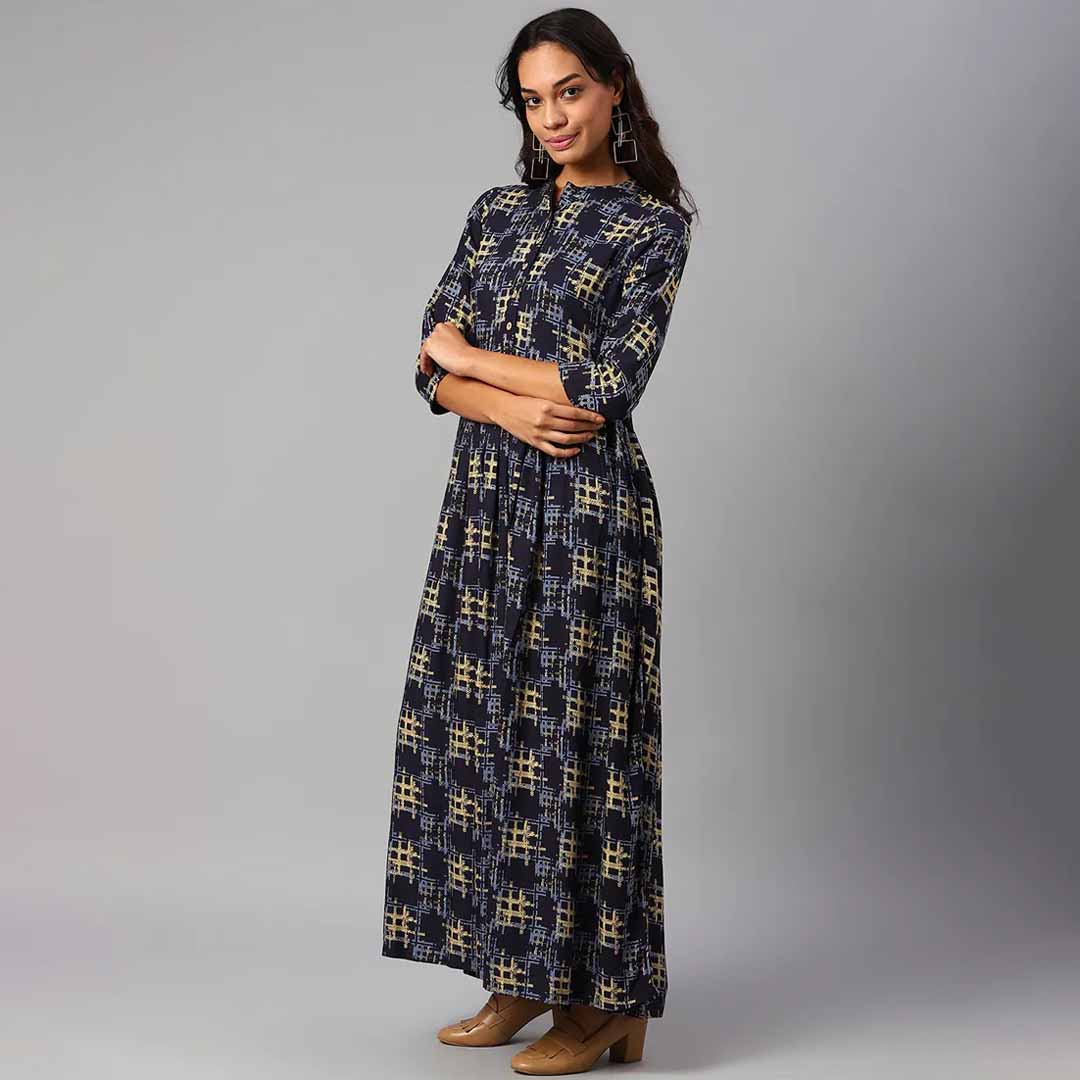 neck printed maxi dress looking for some awesome collection of dresses? well, lay your hands on this dress and also get the option of choosing from navy blue colour. dress up in a soothing pattern and don this dress made of rayon material