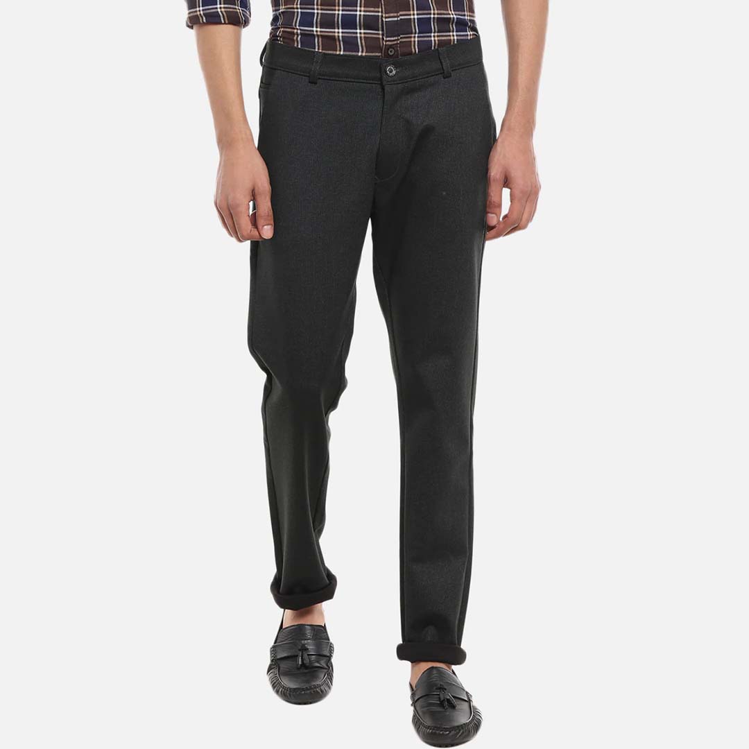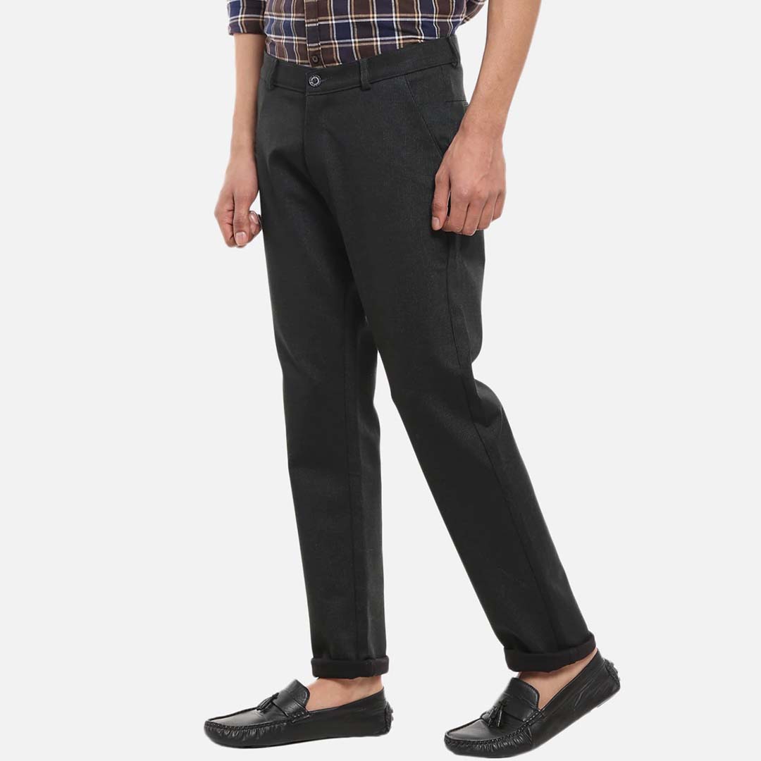 level up your wardrobe essentials with this stylish pair of slim fit trousers from arrow. the cotton spandex blend fabric of the trousers ensures an impeccable fit and comfort. match them with a solid t-shirt and your favourite pair of sneakers for a relaxed, casual look.