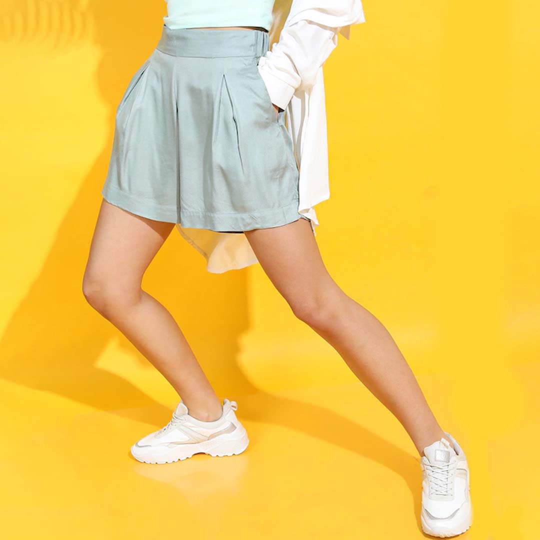 Olive green solid mid-rise regular shorts, has 2 pockets, drawstring closure